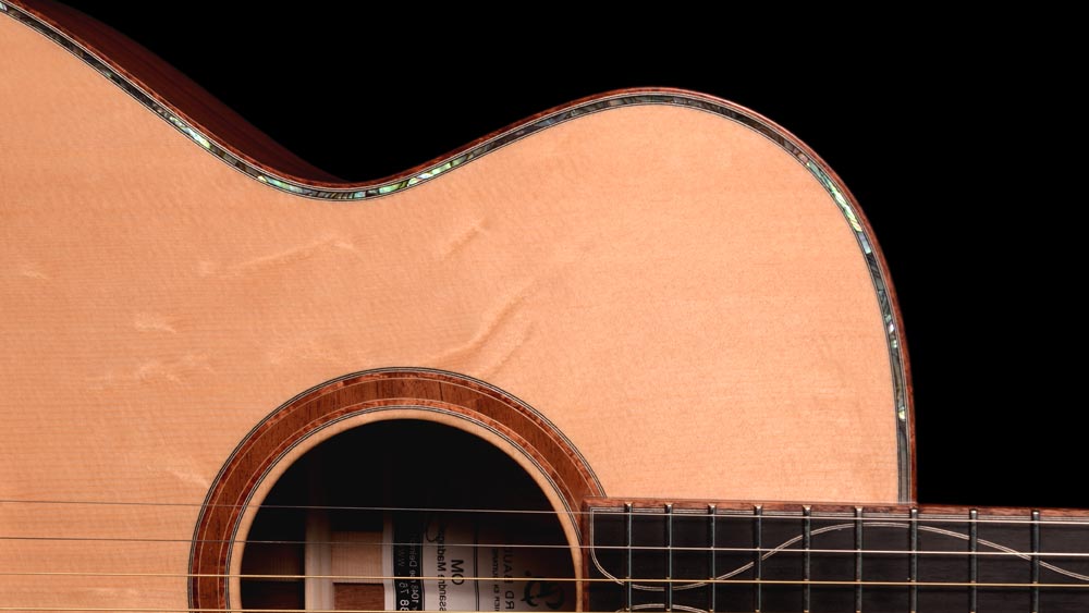 OM Madagascar N°108 Fond et éclisses en palissandre de Madagascar Table épicéa Sitka chenillé Manche acajou du Honduras Touche et plaquage de tête ébène du Gabon Fileterie koa rosaces Madagascar et koa Sillets os Mécaniques Schaller "Grand tune" bouton ébène Largeur au sillet : 45 mm Poids 2000g voir la video |